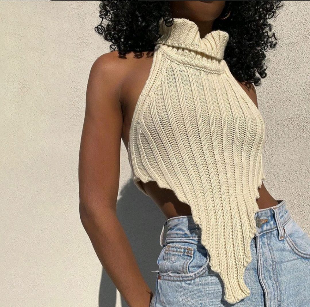 SEZY SOLID COLOR BACKLESS TURTLE NECK KNITTED TANK TOP