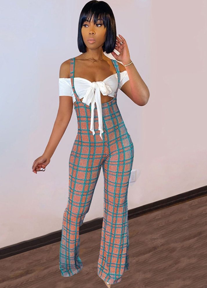 Plaid overalls two piece set