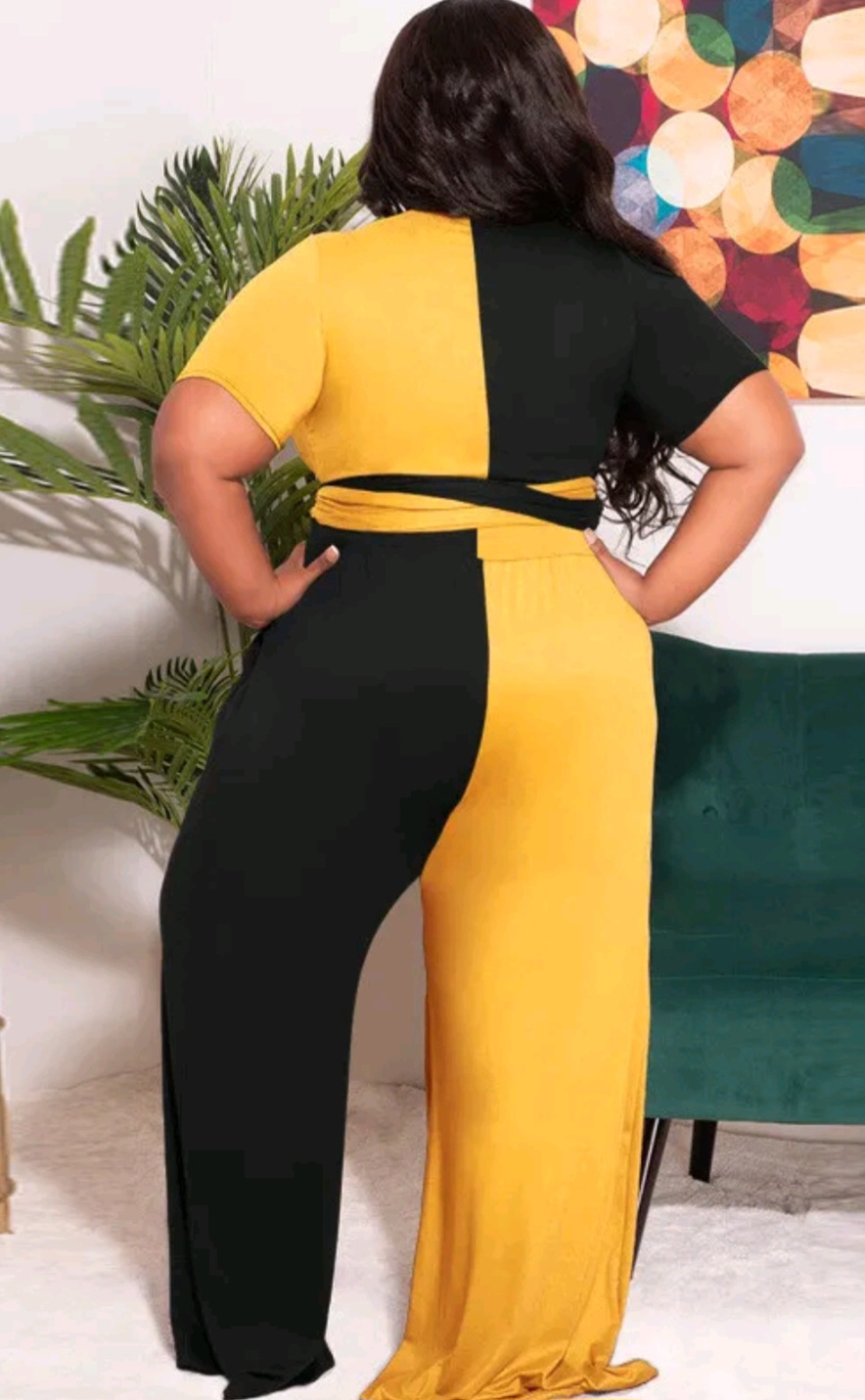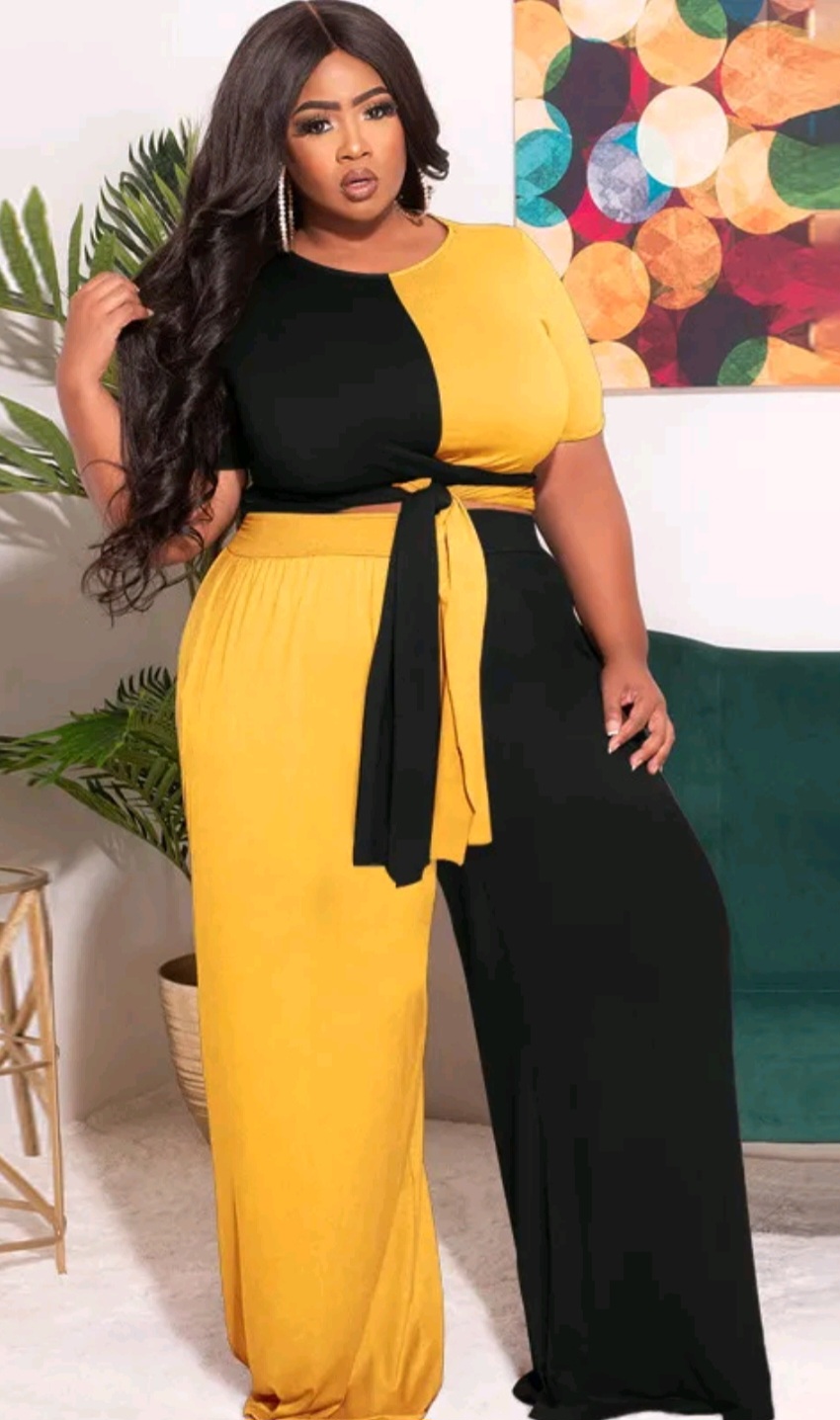 Plus Size 2-Piece Color Block Tracksuit with a short-sleeve drawstring top and wide-leg pants.