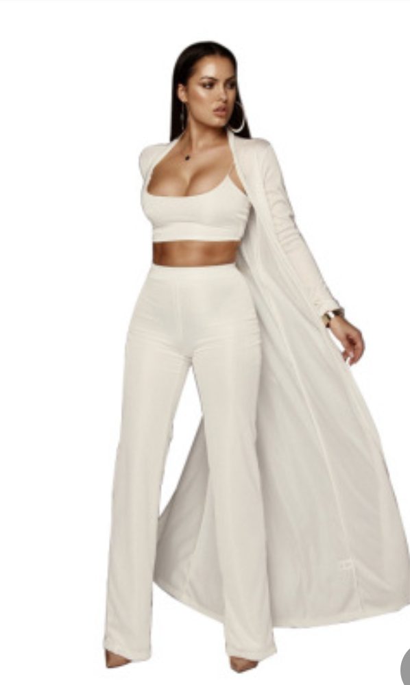 3-piece loungewear set featuring a long cardigan, a crop top, and wide-leg pants.